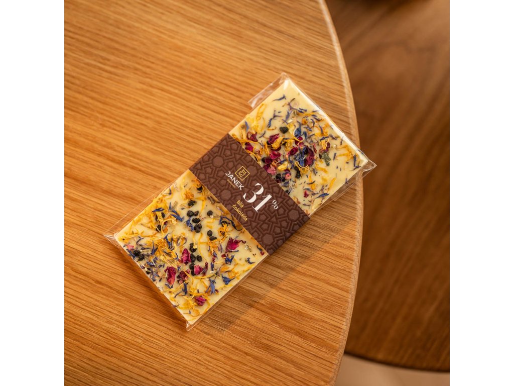 Jemná biela čokoláda s príjemnou vôňou vanilky a kvetov: nechtík, baza, nevädza a ruža. Bez umelých aróm a esencií – len skutočné vanilkové zrná a pravé bylinky. Neobsahuje lepok ani palmový olej. Každý kúsok poteší milovníkov čokolády, ktorí ocenia prírodnú chuť a lahodné bylinky. Zloženie: kakaové maslo 31,1 %, sušené plnotučné mlieko, cukor, nechtík, kvet bazy, chrpa, ruža, emulgátor: sójový lecitín, aróma: prírodná vanilka. Minimálna trvanlivosť: 9 mesiacov. Váha: 85 g