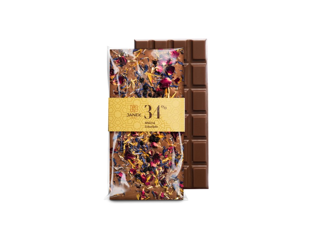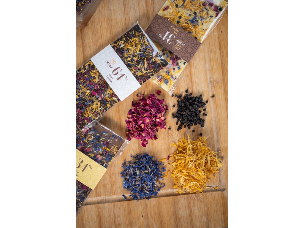 Jemná mléčná čokoláda s kousky květů – měsíček, bez, chrpa a růže – okouzlí svou vůní a jemnou chutí přírody. Neobsahuje žádné aroma, jen pravá vanilková zrnka. Bez lepku a palmového oleje. Každé sousto se pomalu rozplývá na jazyku a nabízí harmonické spojení mléčné čokolády a bylin. Složení: kakaová hmota (34%), kakaové máslo, sušené mléko, cukr, měsíček, květ bezu, chrpa, růže, emulgátor: sójový lecitin, aroma: přírodní vanilka Minimální trvanlivost: 9 měsíců. Váha: 85 g