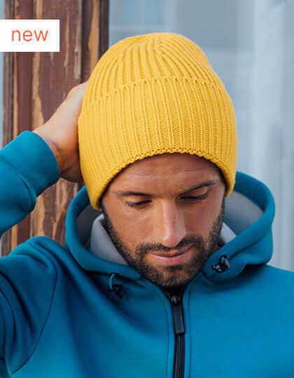 Hrubě žebrovaná pletená čepice z měkké, hřejivé příze Polylana® | Jednovrstvý úplet se širokým ohrnovacím lemem a vysoce módním vrškem | Recyklovaný polyester | Polyester Polylana® - při výrobě bylo ušetřeno 9 litrů vody