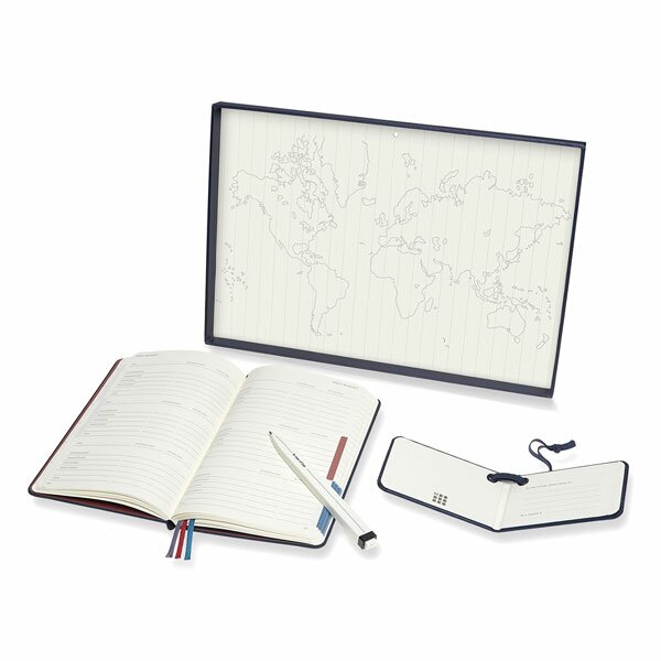 Souprava obsahuje zápisník Moleskine Voyageur, kuličkové pero Moleskine Go Pen a visačku na zavazadla.