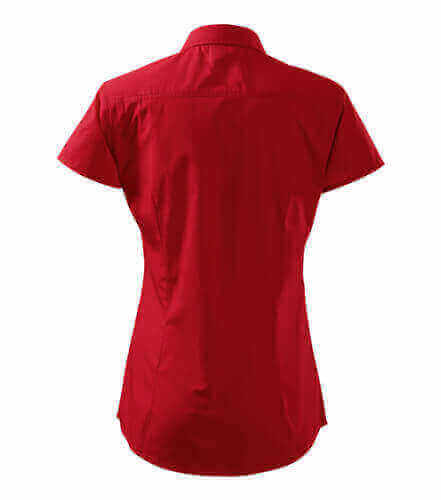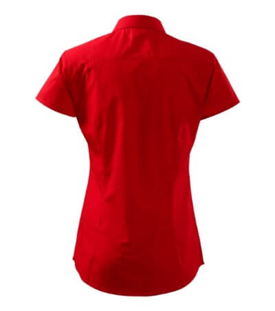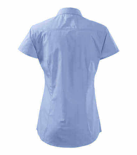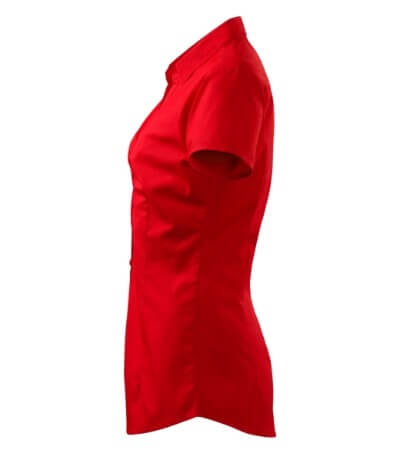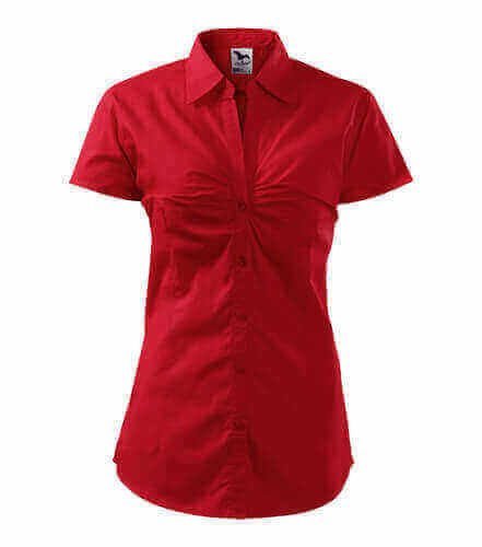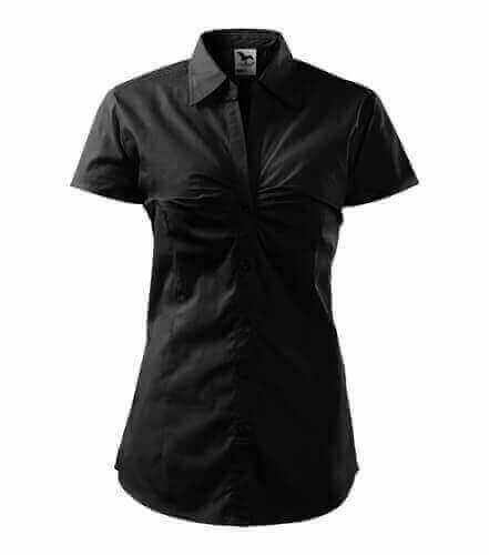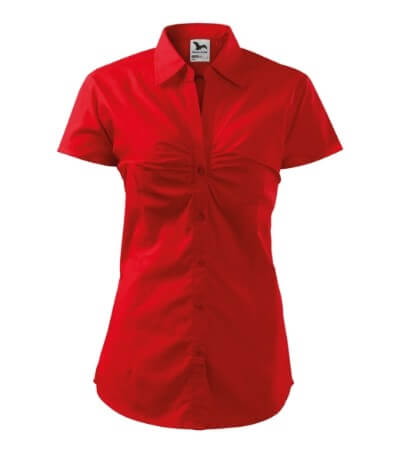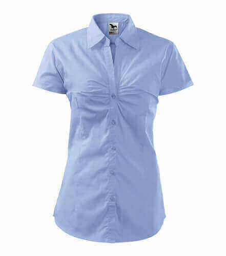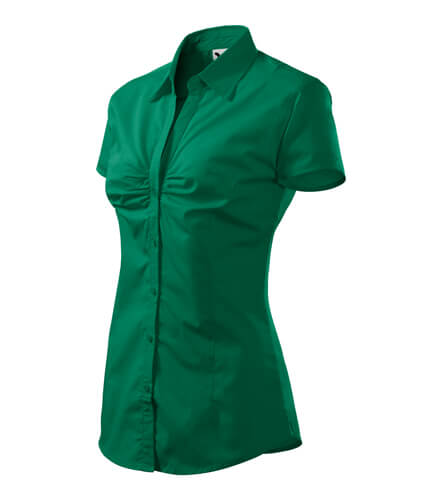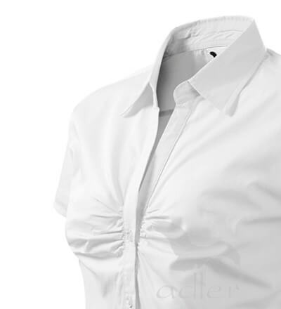 Dámská halenka s krátkým rukávem z jemného materiálu tvarovaná pásovými záševky. V oblasti hrudníku zdobená řasením zvýrazňující dámskou siluetu. S rozhalenkou a dvojdílným košilovým límcem. Přední okraje začištěny légou. Zapínání na knoflíky s jedním náhradním knoflíkem. Tvarovaný dolní okraj.