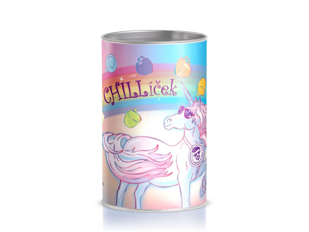 Čaj Chillíček je ovocná čajová směs pro věčné optimisty a milovníky pozitivní energie. Vychutnej si doušek slunce, barev a fantazie, kde tě překvapí i cukroví jednorožci. Čaj lze zalít dvakrát, doporučené louhování 8–10 minut. Složení: kandované kousky ananasu, kousky jablka, mrkve, květy ibišku, bílé a růžové jednorožci z cukru, kousky červené řepy, jahody, vanilky, barvivo (koncentrát z červené řepy), přírodní Váha: 70 g