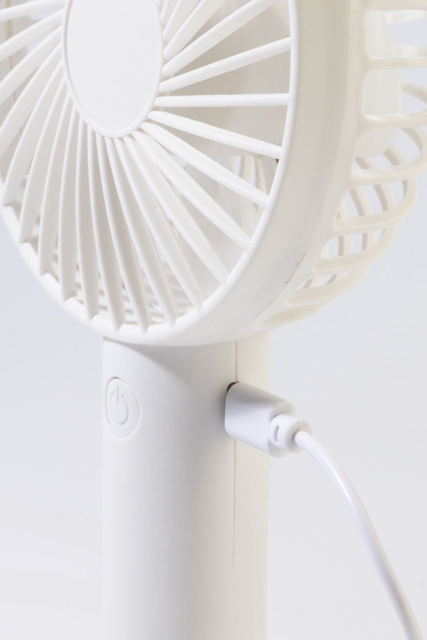 Elektrický ruční ventilátor z recyklovaného PP s držákem na mobilní telefon, stolním stojanem a vestavěnou dobíjecí baterií s USB portem (800 mAh). Se 3 rychlostmi. Včetně nabíjecího kabelu s USB...