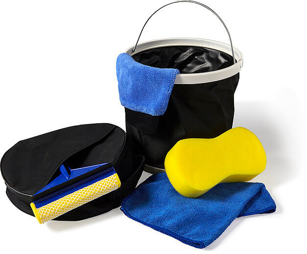 Šestidílná sada na mytí aut s robustním skládacím kbelíkem s kovovou rukojetí, hadříkem z mikrovlákna, houbou, pračkou a stěrkou. Baleno v 600D polyesterovém sáčku s rukojetí.