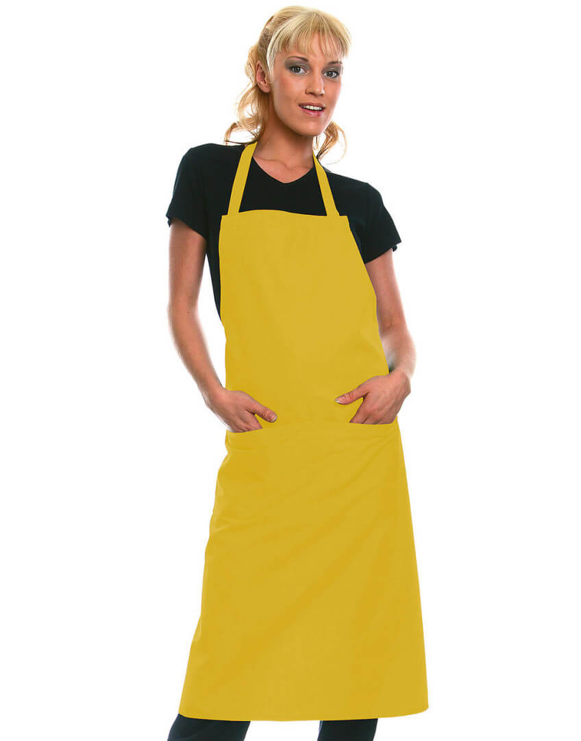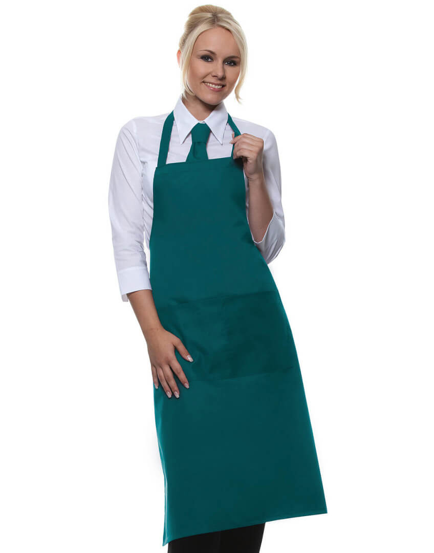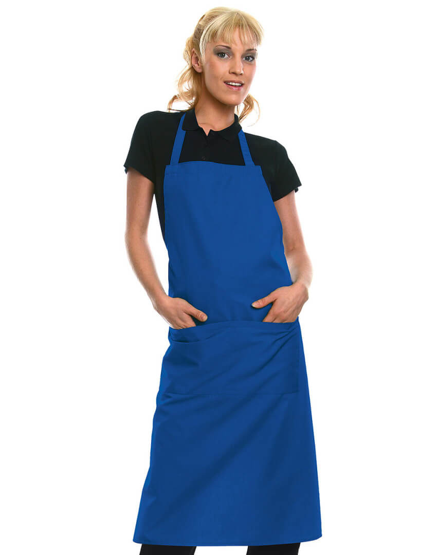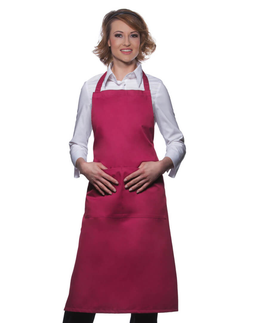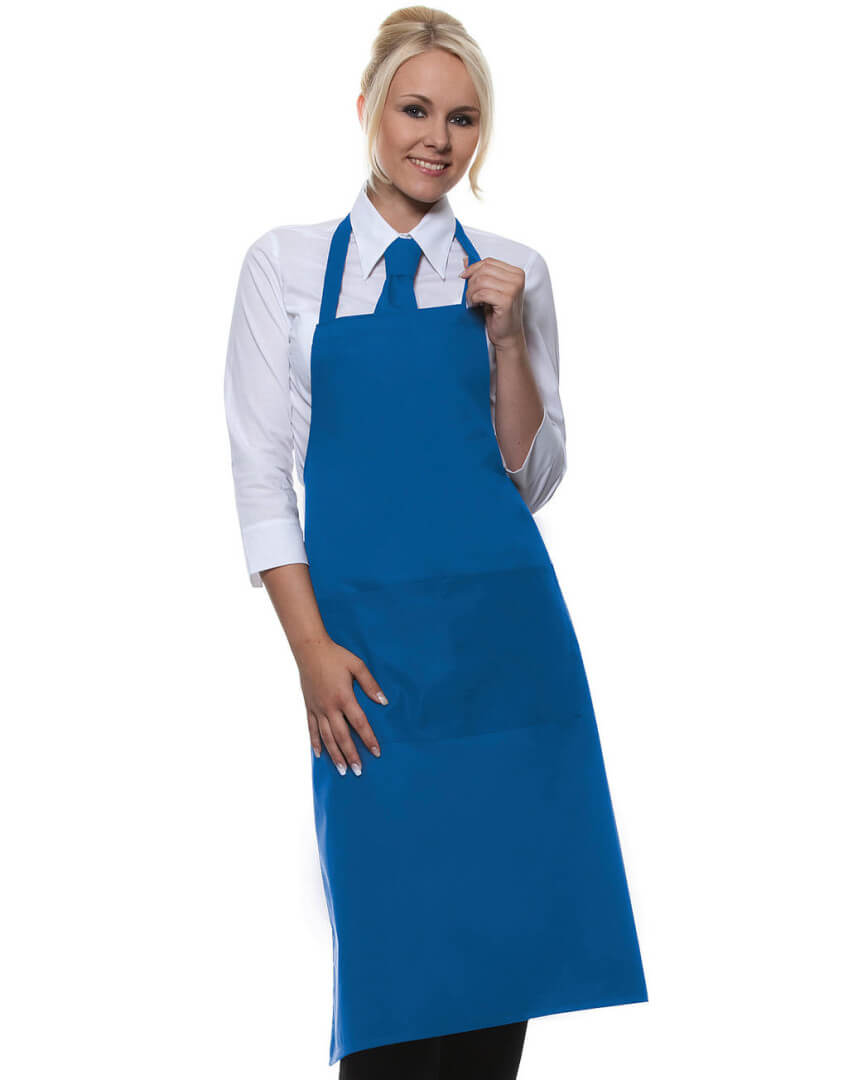 ·215 g/m² ·65% polyester, 35% předepraná kvalitní bavlna ·pevný pásek ·pásek u krku: 60 cm ·kapsa s 2 přihrádkami ·vhodné pro průmyslové praní ·lze prát až na 95°C ·trvanlivá barva, snadné ošetřování ·rozměry: 75 x 95 cm