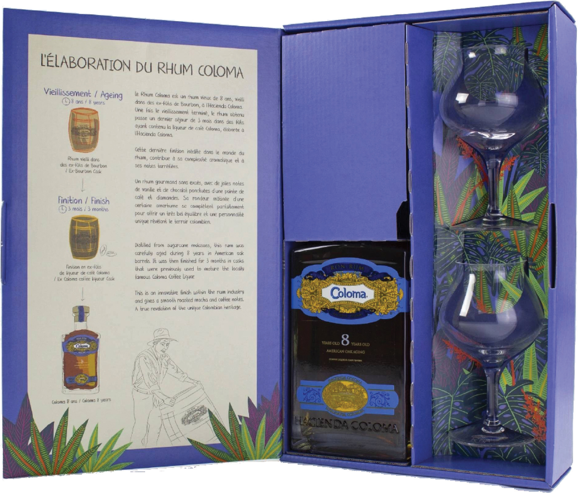 Výjimečný kolumbijský rum s osmiletým zráním v sudech po bourbonu a finálním zráním v sudech po kávovém likéru. Přináší svůdné tóny kávy, čokolády, vanilky a mandlí s dlouhým jemným závěrem. Dárkové balení se dvěma skleničkami je ideálním tipem pro milovníky rumu i objevitele nových chutí – pro potěšení během svátků i výjimečných chvil. Původ: Kolumbie. Objem: 700 ml