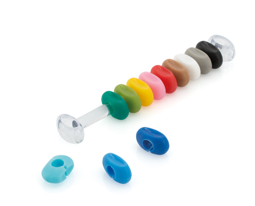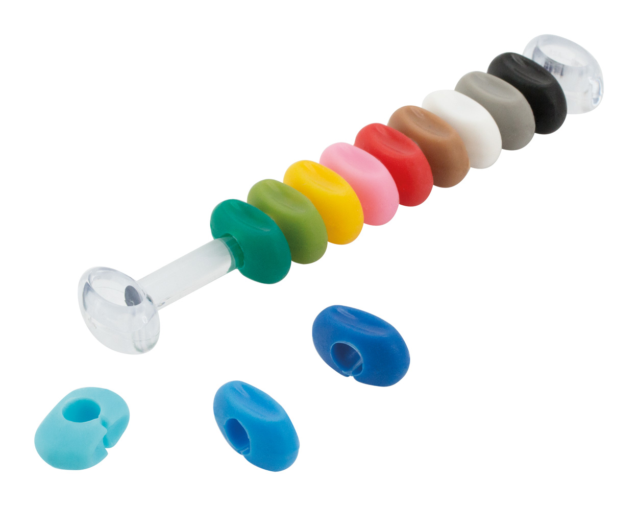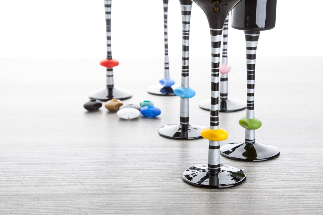 12 ks silikonových rozlišovačů na skleničky s plastovým držáčkem.