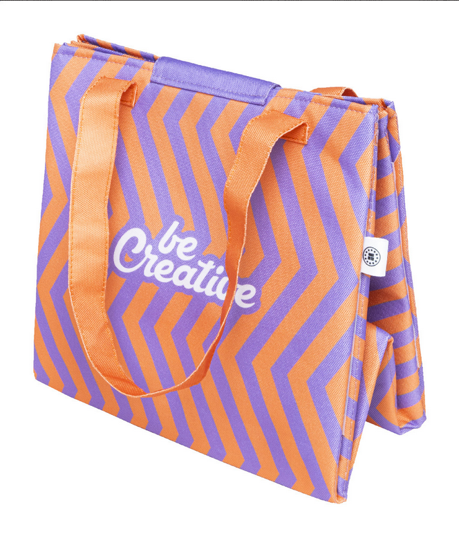 Chladící taška na zakázku z 600D RPET polyesteru s hliníkovým polstrováním, zapínáním na suchý zip a dlouhými rukojeťmi. Slouží také jako košík a lze ji rozložit k použití jako piknikovou deku. S celoplošným sublimačním potiskem a výrazným štítkem RPET. Cena nezahrnuje tiskovou přípravu. Min. mn.: 25 ks. Be Creative. Nosnost tašky: 1.5 kg. Objem tašky: 15.625 l
