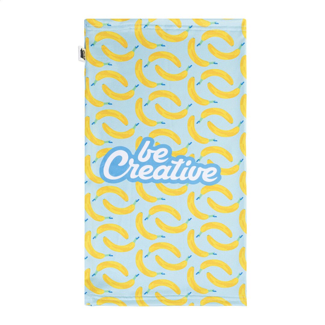 Na zakázku vyrobený víceúčelový šátek z RPET s celoplošným sublimačním potiskem. 92% RPET polyester a 8% elastan (185 g/m²), s výraznou RPET etiketou. Cena nezahrnuje tiskovou přípravu. Min. mn.: 50 ks. New. Go Green. Be Creative. Material 2 weight: 185 g/m2