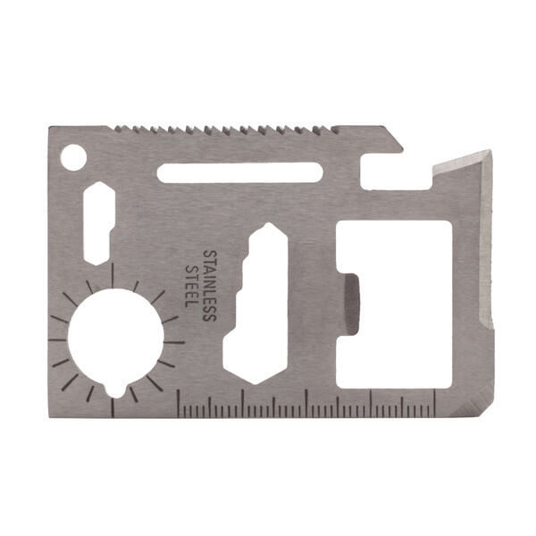 Sada nářadí z oceli s 11 funkcemi ve velikosti kreditní karty v pouzdru z PU. Funkce: otvírák na konzervy, nůž, plochý šroubovák, měřítko, otvírák na láhve, očkový klíč (4 velikosti), motýlkový klíč, pilka, úhloměr, plochý klíč (2 velikosti) a očko pro napínání lanka.