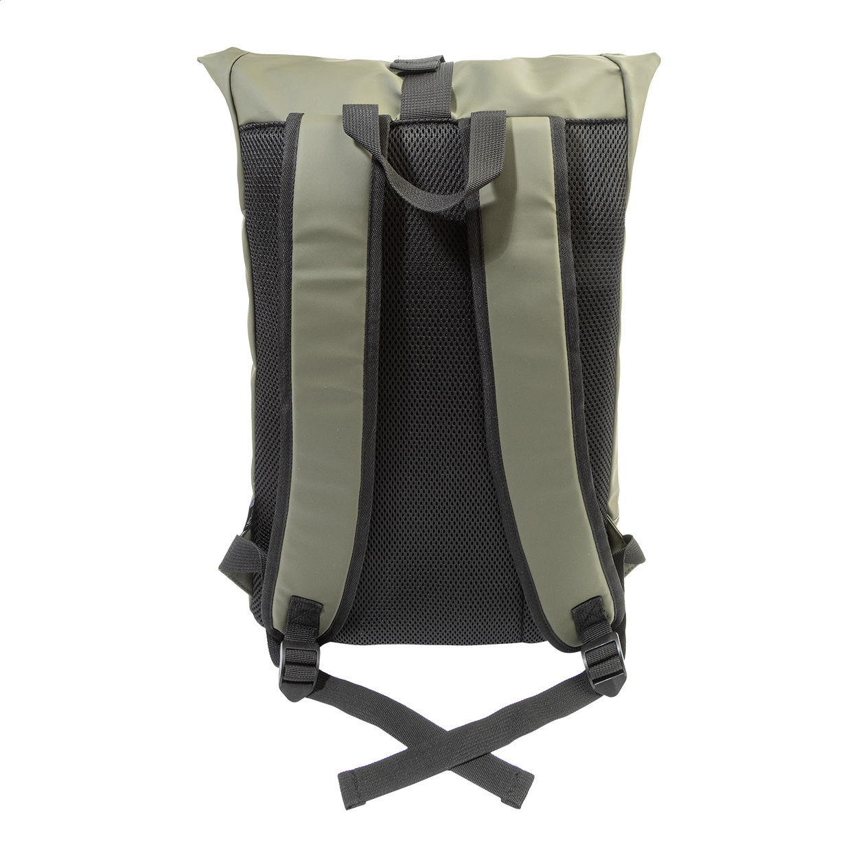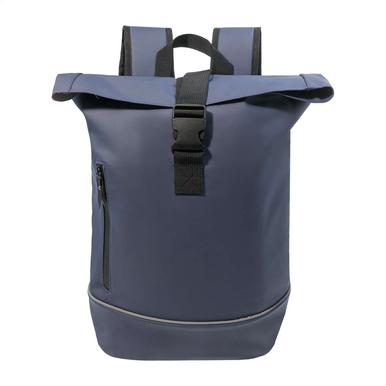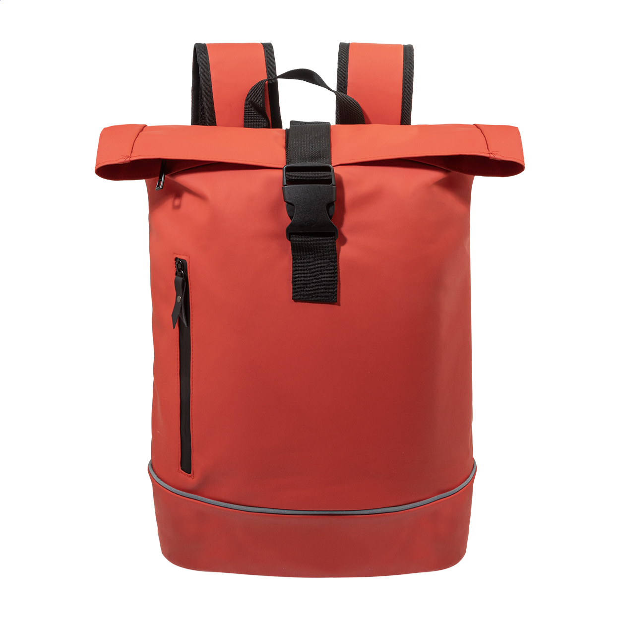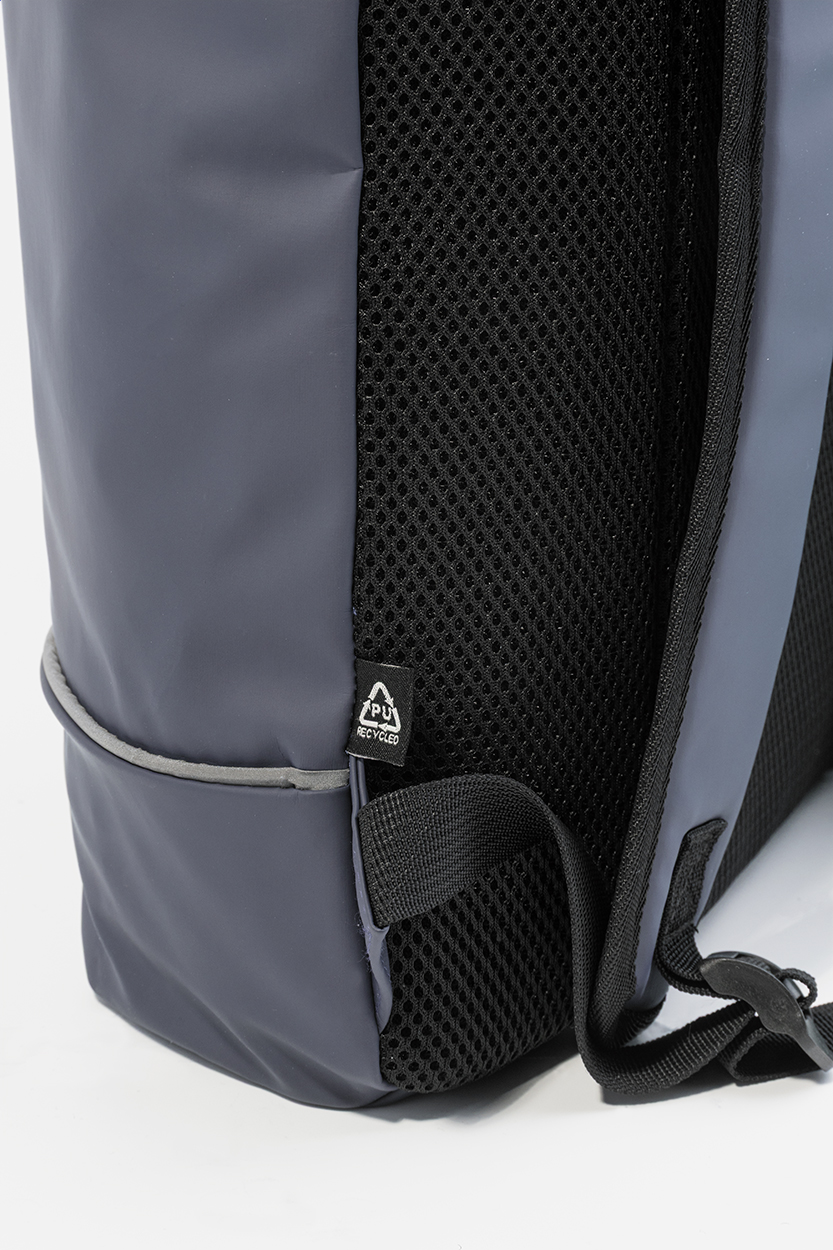 Voděodolný batoh s rolovacím vrškem z měkké recyklované PU kůže s hlavní přihrádkou na zip a zapínáním na přezku, přední kapsou s voděodolným zipem, polstrovanou přihrádkou na notebook (15") a reflexním proužkem. S polstrovaným hřbetem a ramenními popruhy. New. tašky: 25 l