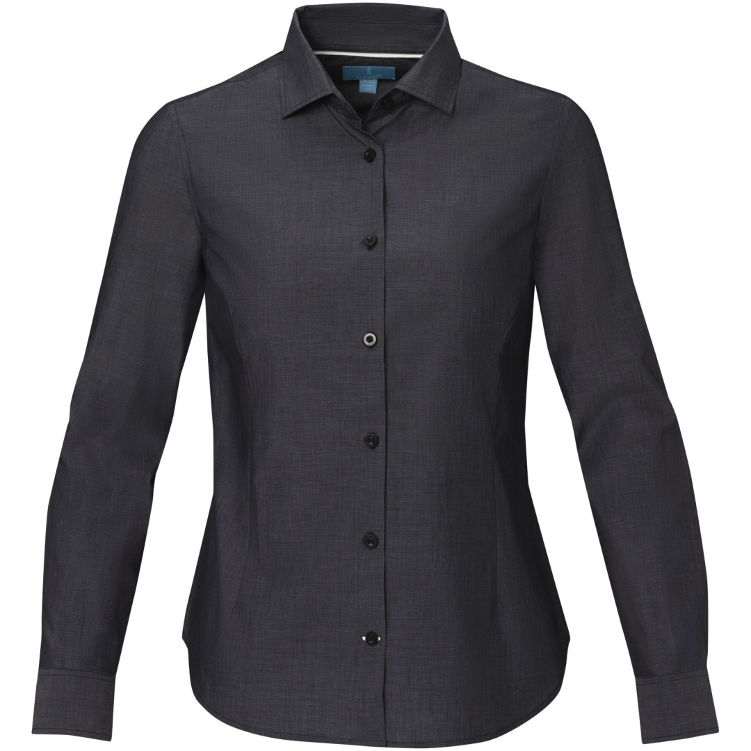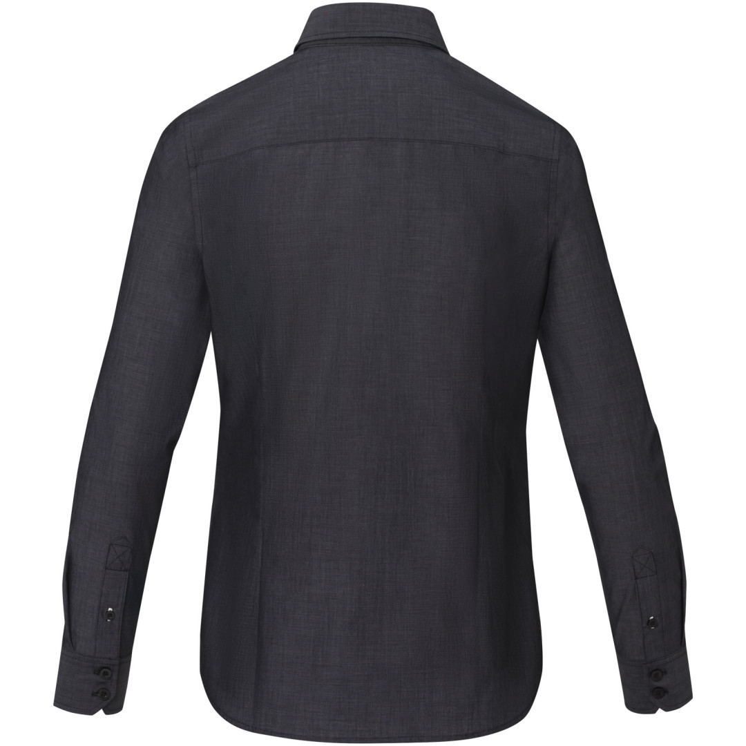 Udržitelné propagační oděvy. Polootevřený límeček. Gravírované perleťové knoflíčky. Nastavitelná manžeta s jednoduchým záhybem. Saténové lemování na vnitřní straně výstřihu. Kontrastní prošití na manžetách rukávů a spodní knoflíkové léze. Tkaný štítek.