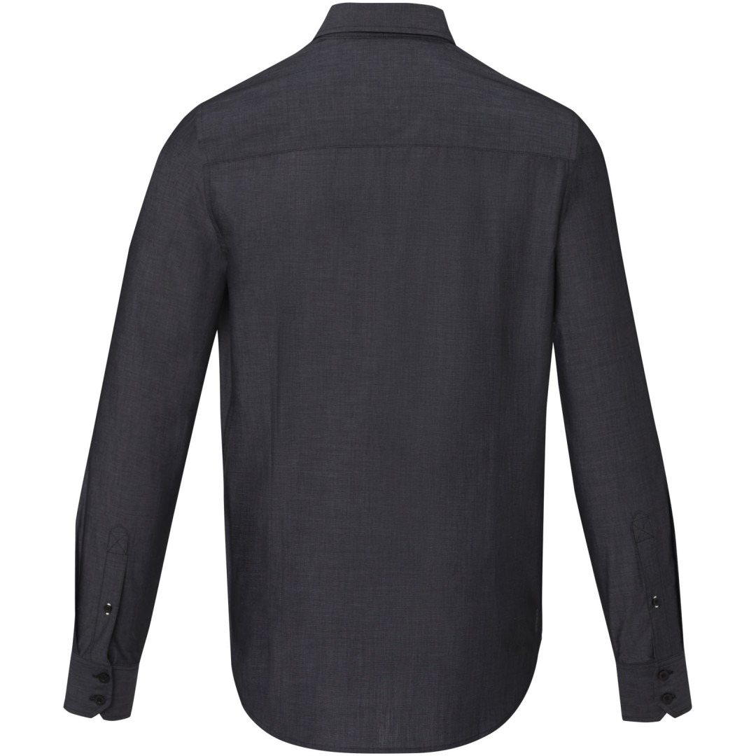 Udržitelné propagační oděvy. Polootevřený límeček. Gravírované perleťové knoflíčky. Nastavitelná manžeta s jednoduchým záhybem. Saténové lemování na vnitřní straně výstřihu. Kontrastní prošití na manžetách rukávů a spodní knoflíkové léze. Tkaný štítek.