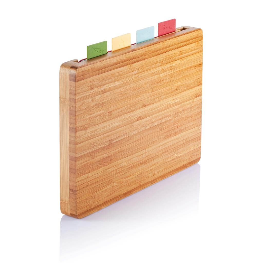 Moderní sada hygienických kuchyňských prkének. Bambusové kuchyňské prkénko 35 x 25 cm, které slouží i jako úložný box pro 4 hygienické prkénka z PP (vhodné pro mytí v myčce). Barva a obrázek značí, pro jaký typ potravin je prkénko určeno.