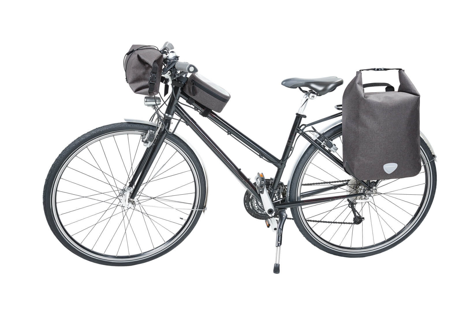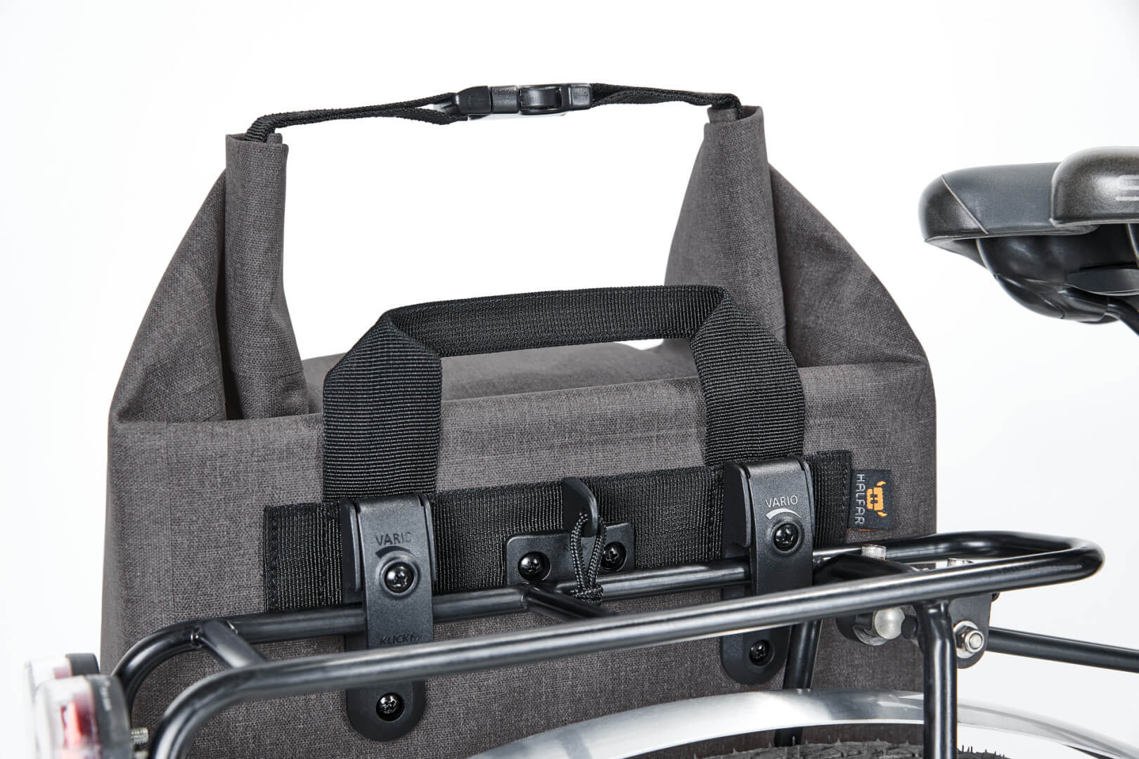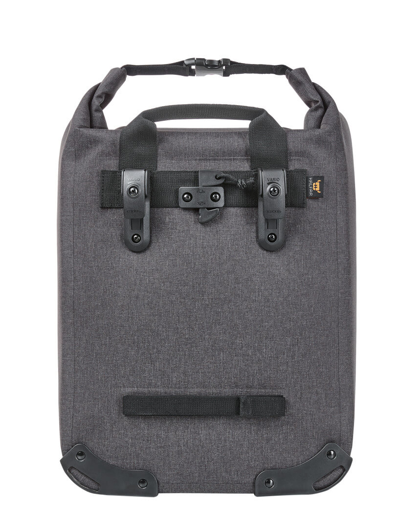 Polyester 600D | Městská cyklistická taška s prostornou hlavní kapsou | Velká vnitřní kapsa na zip | Uzavírání „roll-top“ | Svařované švy spolehlivě ochrání proti dešti a vlhku | Ochrana základny a rohů | Individuálně nastavitelný držák pro upevnění na cyklistické tašky s otočným zámkem pro zajištění, klopa na suchý zip vespod zadní části pro další zajištění (systém držáků klickfix®) | Dekorativní reflexní nášivka | Ucho | Kompatibilní s vložkou na notebook | Veganské | Obsah/dekorace nejsou součástí balení