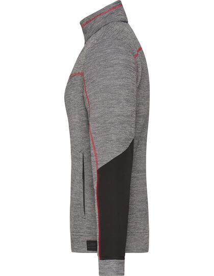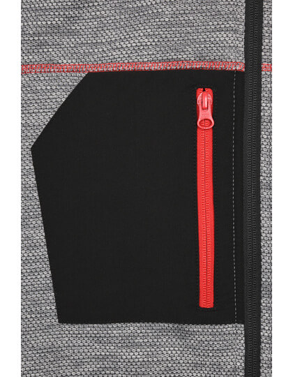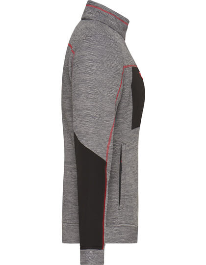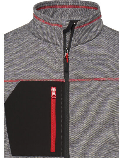 Pletená flísová bunda se snadnou údržbou | Měkká, teplá, snadno udržovatelná látka v melanžovém vzhledu | Vnější strana: Hladký, texturovaný vzhled | Vnitřní strana: Měkký, načechraný a česaný materiál | Dvě boční kapsy se skrytým zipem, dvě vnitřní kapsy | Náprsní kapsa z tkané látky s kontrastním zipem | Kontrastní šití | Stojáček | Po celé délce skrytý zip s ochranou brady | Zipy: YKK |