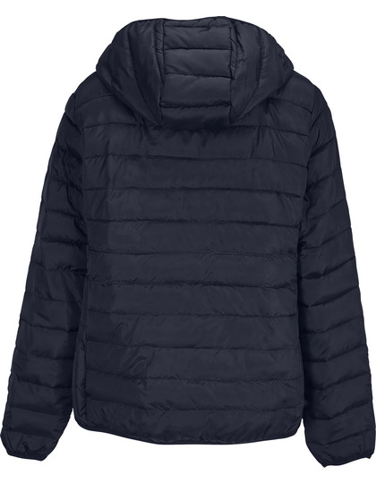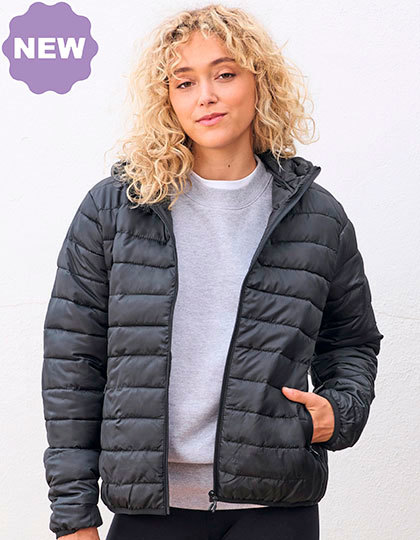 Vnější materiál a podšívka: recyklovaný polyester, zateplení: polyesterové peří | Přední zapínání a boční kapsy se sladěným nylonovým zipem | Sladěné kovové posuvníky s černými stylovými jezdci | Kapuce s pružným otvorem | Sladěné elastické lemování na manžetách a spodní části