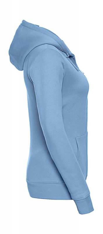 ·280 g/m² ·80% česaná bavlna ring spun, 20% polyester (třívrstvá látka) ·dvouvrstvá kapuce ·ploché stahovací šňůrky ·výztužná páska páska za krkem s nápletem rybí kostra ·úzší v ramenou s bočními švy ·skrytý kovový YKK zip (antické stříbro) pro snadnější dekorace ·přístup k MP3 sluchátkům ·2 přední kapsy ·průramky, manžety a lem se skrytými švy ·moderní dámský střih