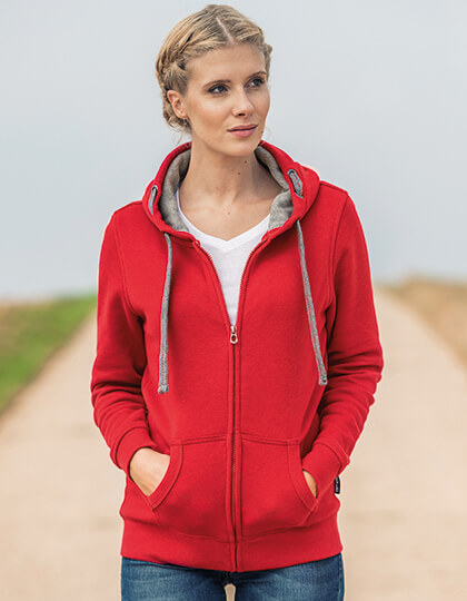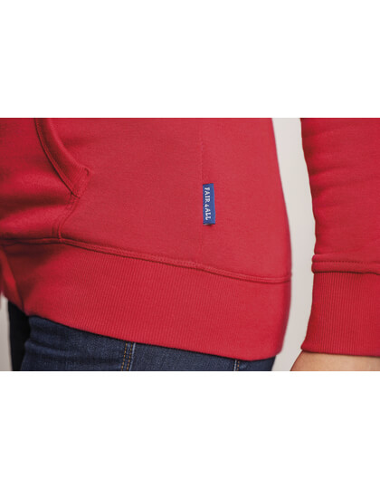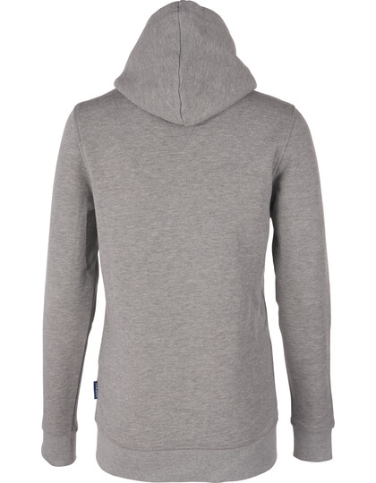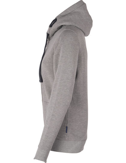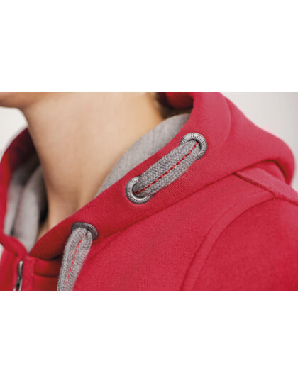 Vyrobeno ze zvláště měkké smíšené textilie z 80% bavlny a 20% polyesteru. Módní moderní střih. Uvnitř kartáčovaný. Kapuce s kontrastní podšívkou. Plochá, vyšívaná kontrastní stahovací šňůrka se středem. 3 kovové poutka HRM na každé