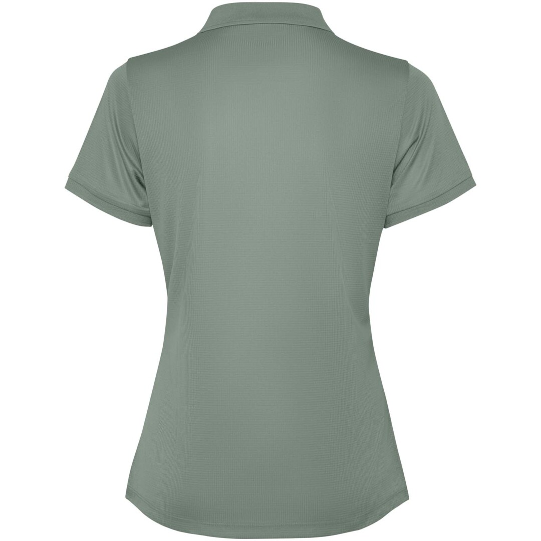 Dámské vypasované polo tričko s krátkým rukávem. Zesílené kryté švy ve vnitřním límci. 1×1 žebrované manžety a límeček. Boční švy. Zapínání na 3 knoflíky a boční rozparky.
