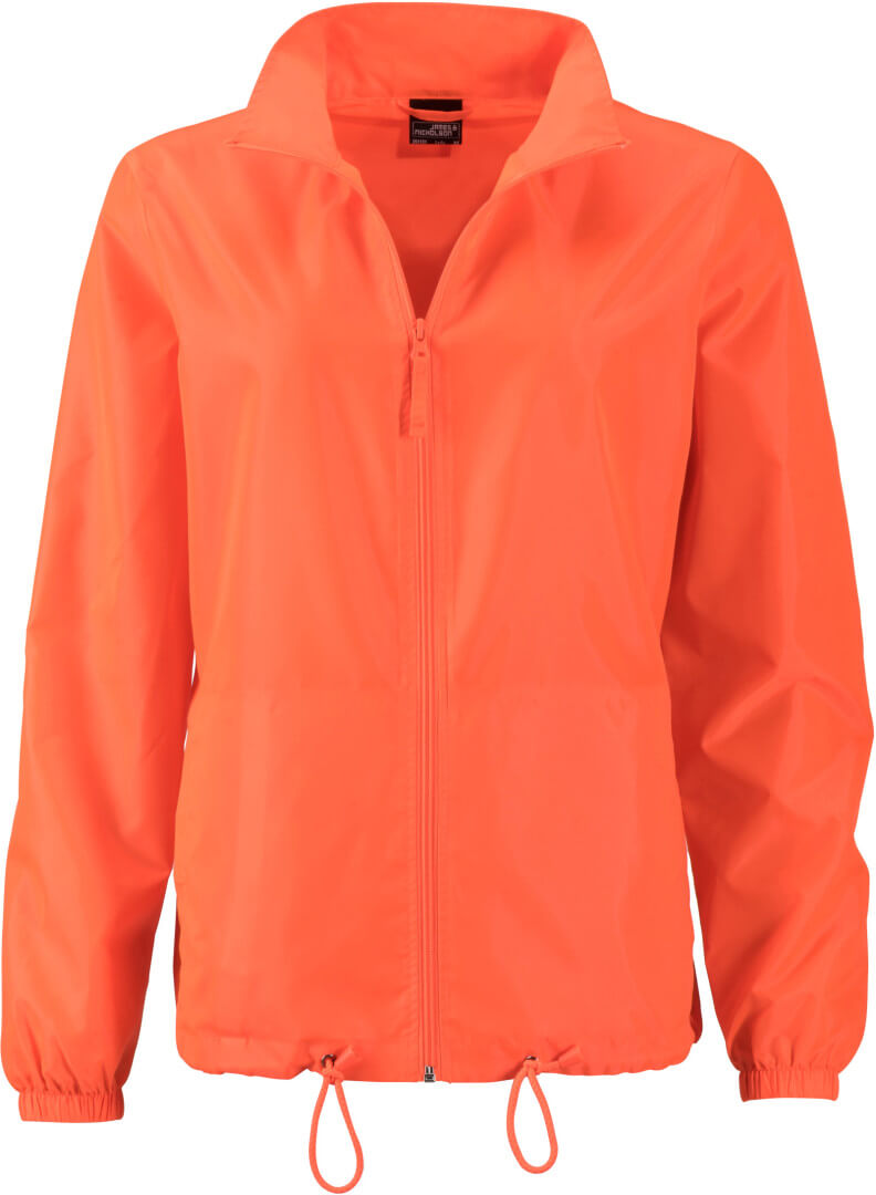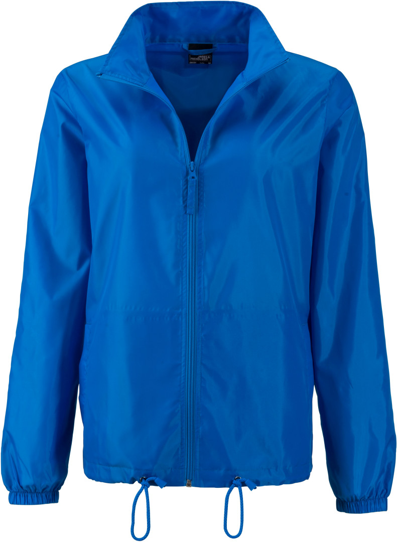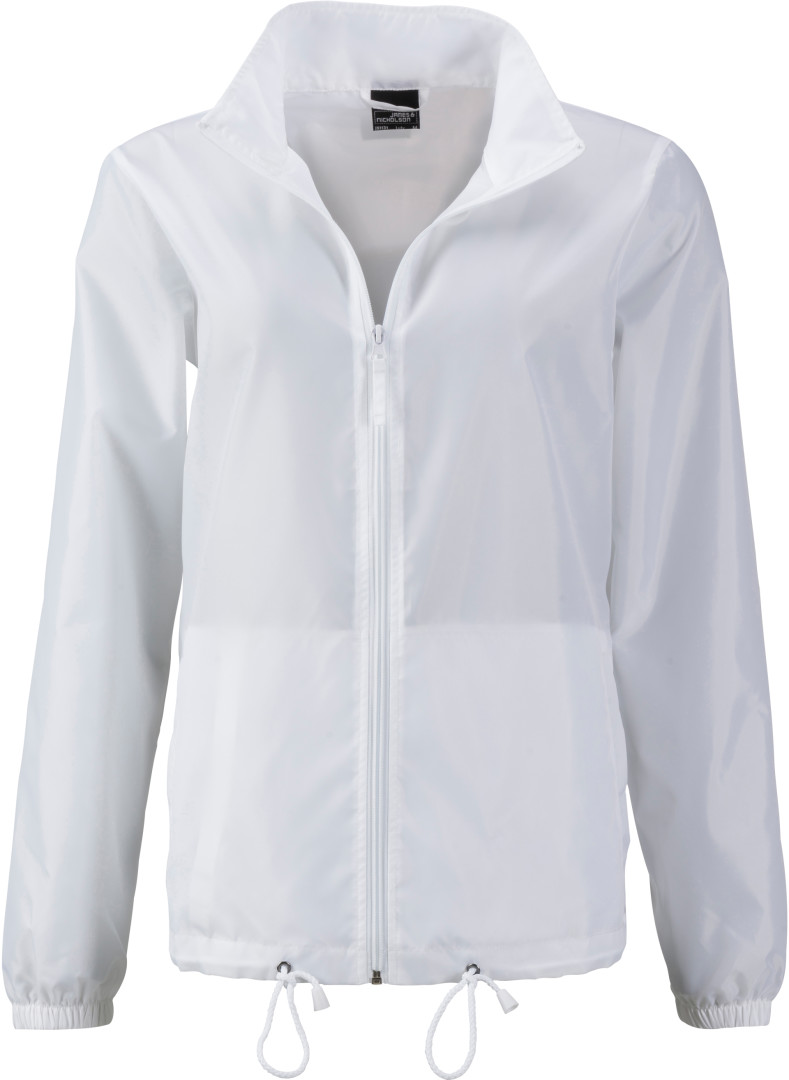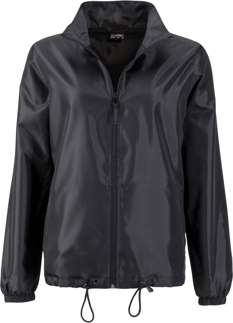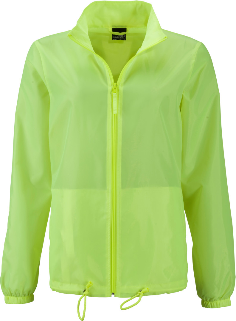 100% polyester vypasovaný střih, lehká vrstvená polyesterová tkanina, chránící před vlhkem a větrem (600 mm vodího sloupce), kapuce se šňůrkou skrytá v límci, 2 postranní kapsy, elastické lemy rukávů, bundu lze schovat do kapsičky a nosit na elastickém pásku