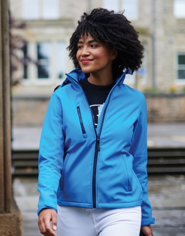Dámská softshellová bunda s kapucňou Venture, gramáž: 300 g/m², vyrobená ze 100% polyester, tkaná softshellová nepromokavá a prodyšná 3-vrstvá membránová tkanina, plně potisknutelná vnější látka, odolnost proti větru a vnitřní membrána, 2 spodní kapsy na zip a 1 náprsní kapsa na zip, odnímatelná softshellová kapuce, nastavitelná šňůrka, nastavitelné manžety, odtrhnutelný štítek.