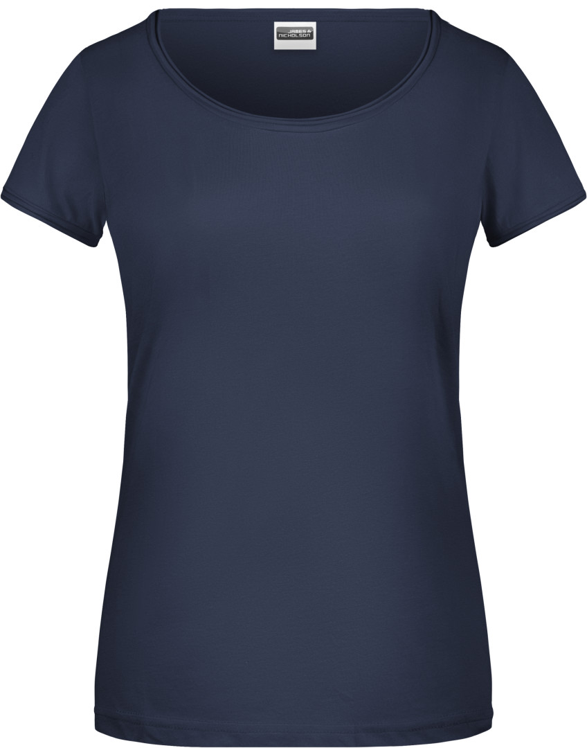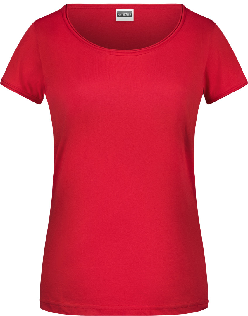 120g/m², 100% OCS certifikovaná bio bavlna dámské tričko delšího střihu, lehce vypasované, hluboký výstřih, rolovací lemy, Tear off!® label a neutrální velikostní label za krkem