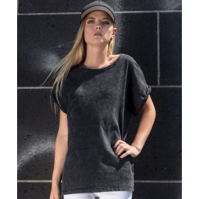 Delší střih, volnější střih, barvené pigmentem, široký žebrovaný kulatý výstřih, přesahující ramena, dvojité švy na lemu, speciální úprava pro dosažení sepraného vzhledu - tento proces vede k barevným odchylkám, neutrální velikostní štítek, pratelné na 30°, nelze sušit v sušičce.