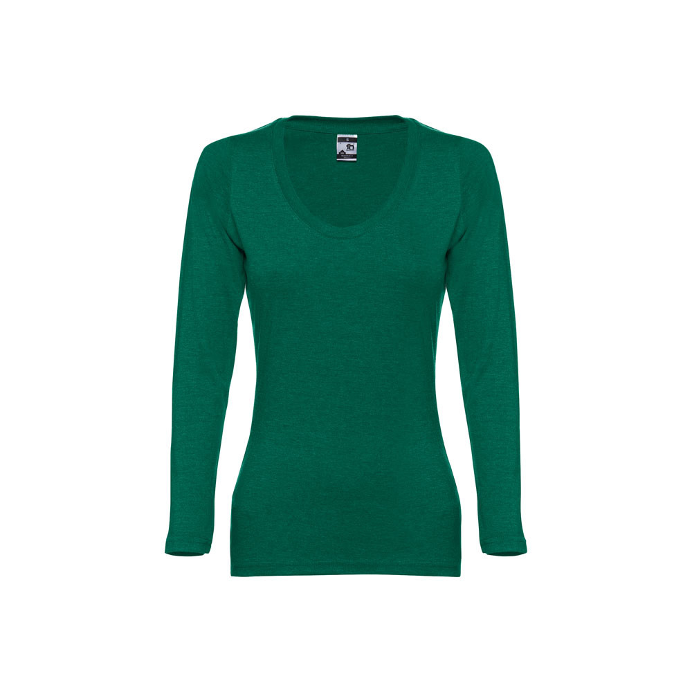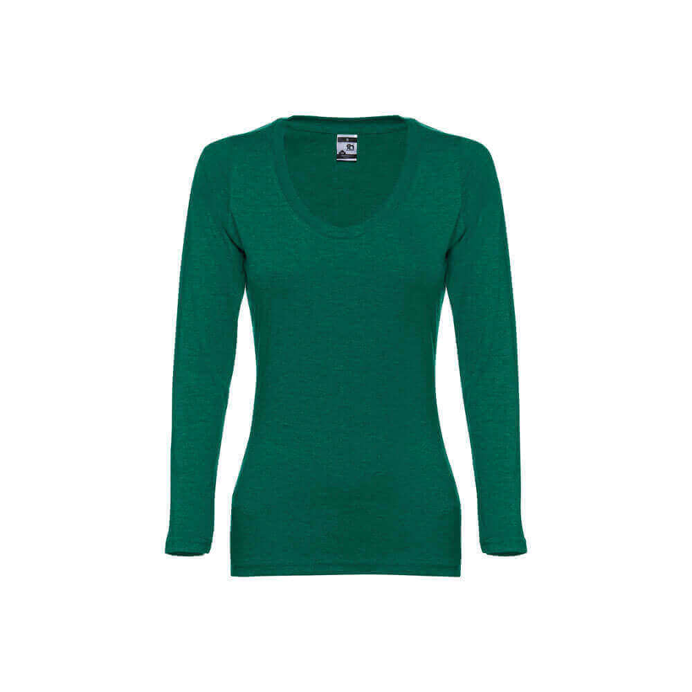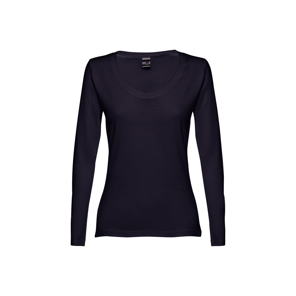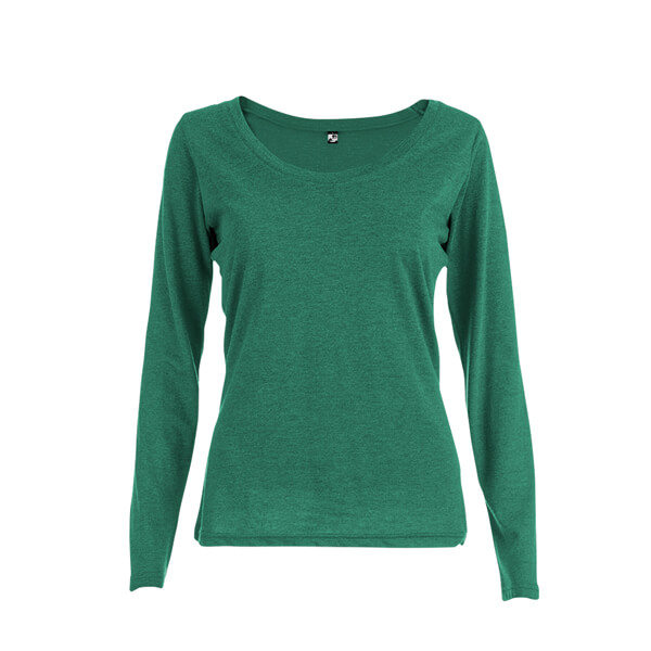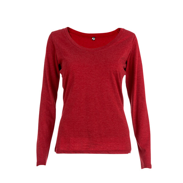 Dámské žerzejové tričko s dlouhým rukávem ze 100% bavlny (150 g/m²). Barvy 94, 95 a 99: 60% bavlna a 40% polyester. Žerzejový lem výstřihu. Dvojité prošití na rukávech a spodním lemu. Střiženo a sešito.