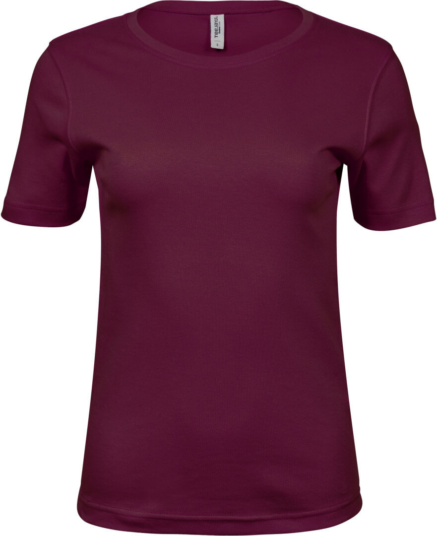 Vypasovaný střih, úzce lemovaný kulatý výstřih s elastanem, dvojité švy, vysoce kvalitní interlock z bavlny s dlouhými vlákny, práno v silikonu pro velmi hladký dotek, pratelné na 60°