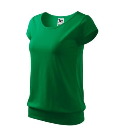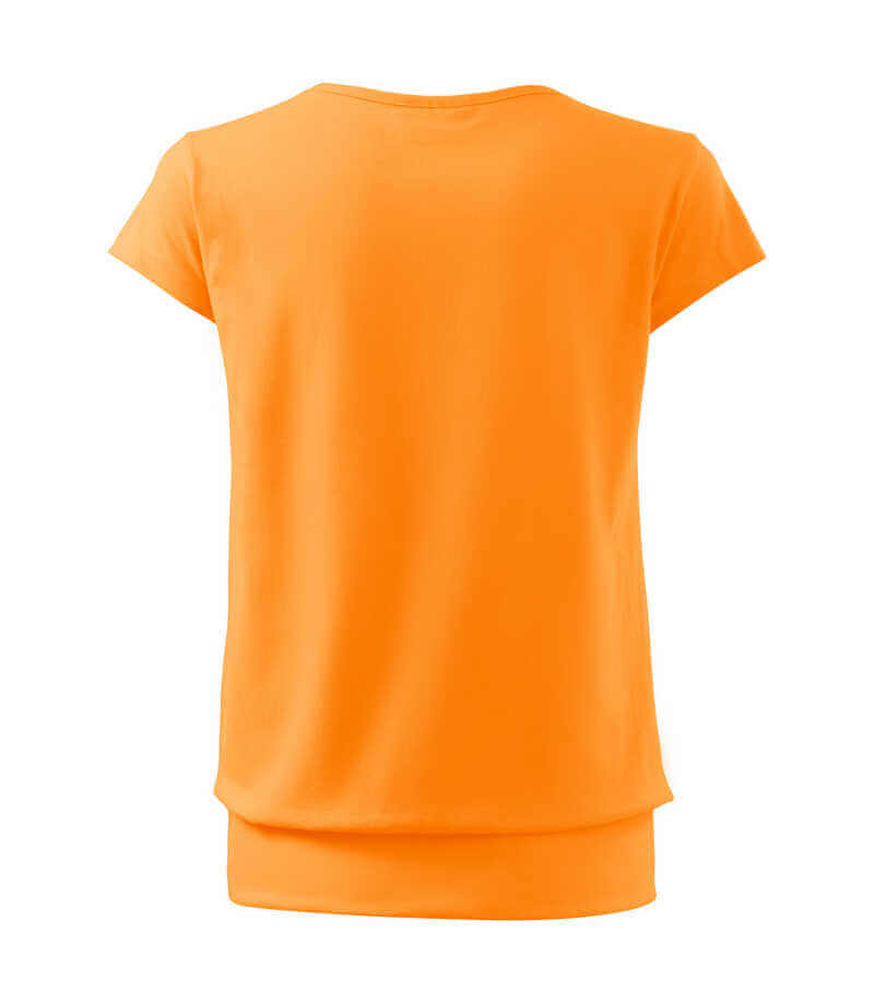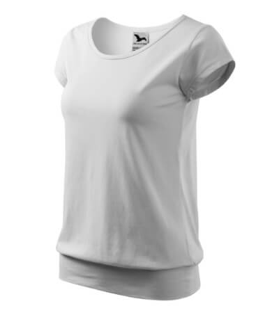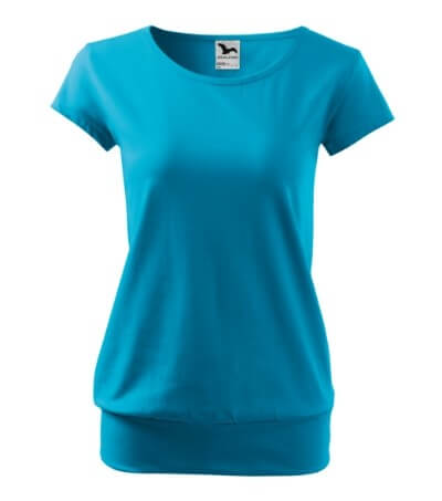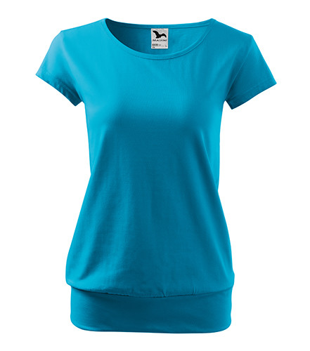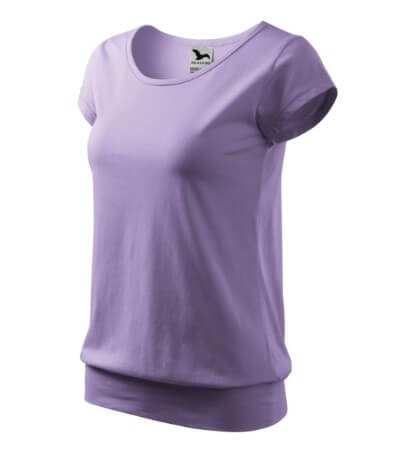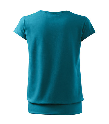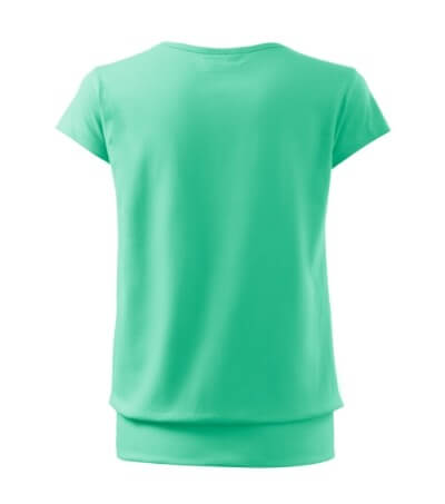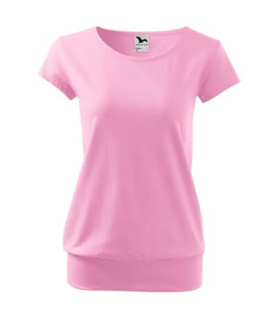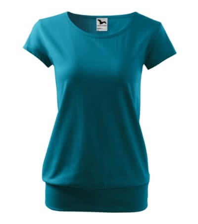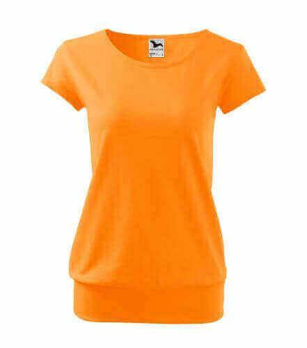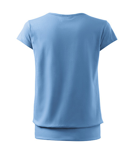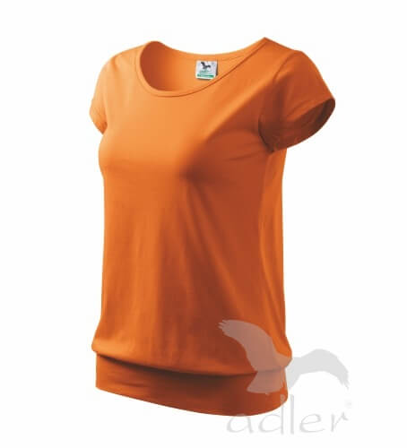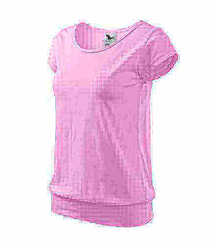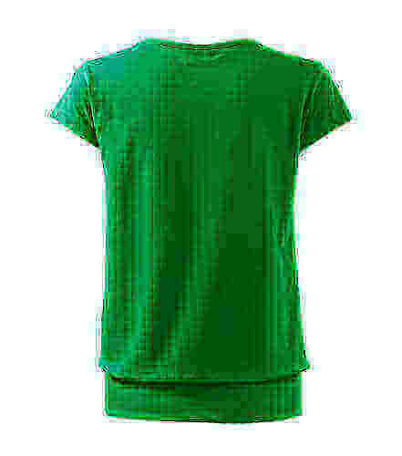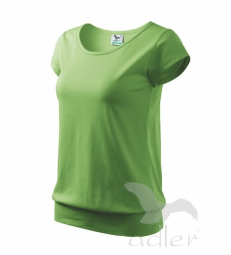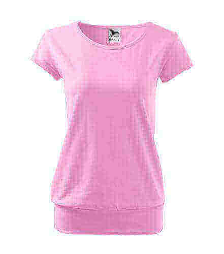 150 g / m2, 100% bavlna, finální silikonová úprava, Single Jersey - Trendové dámské triko s velmi krátkým rukávem, volnějšího střihu, široký spodní lem. Kulatý průkrčník s úzkým lemem ze shodného materiálu. Ramena zpevněné všitým proužkem. Tričko má délku do hloubky boků. Silikonové změkčovadlo zajišťuje splývavost a měkkost na dotek.