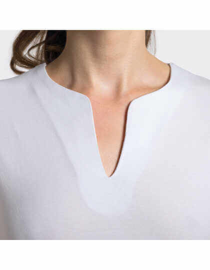 94 % česaná bavlna / 6 % elastan, single žerzej | Úzký, přiléhavý střih | Stylový design | Zaoblený výstřih s výřezem | Krátké rukávy s lemem | Boční švy | Měkký materiál příjemný na dotyk | Odtrhávací štítek