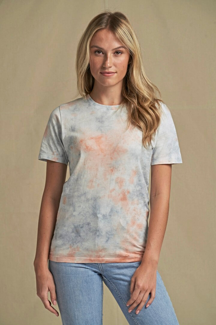 Česaná kruhově dopřádaná bavlna | Moderní střih s postranními švy | Krátké rukávy | Batikovaný vzhled | Každý kus je jedinečný | Pouze štítek s velikostí | Unisex | Zpevňovací páska za krkem | Žebrovaný kulatý výstřih | Dvojité prošití na rukávu a spodním lemu