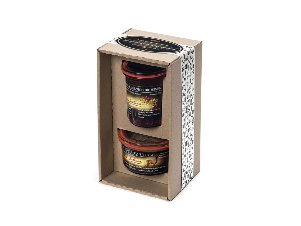 Složení: džem z lesních brusinek 175 g (lesní brusinky (Vaccinum vitis idaea), cukr), srnčí paštika 130 g (srnčí maso (52%), vepřové maso, zelenina (cibule, mrkev, celer), portské %), jídla