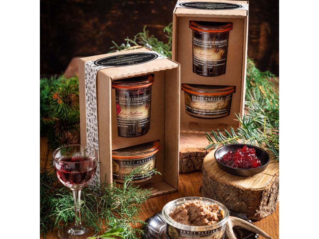 Džem z lesních brusinic 175g, srnčí paštika 130g.