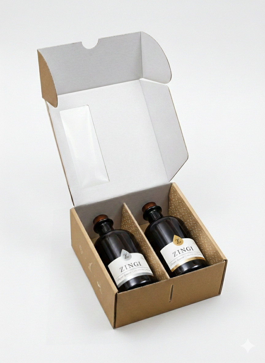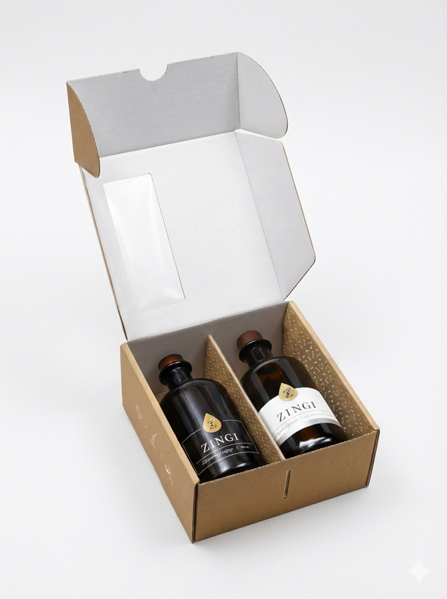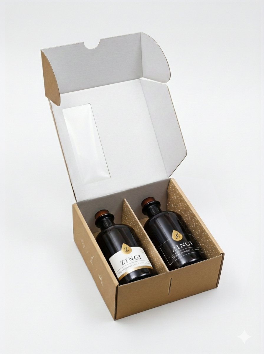 Praktické balení, které si vyskládáte podle sebe. Univerzální dárková krabice ZINGI je určena pro ty, kteří chtějí vytvořit vlastní balení z našich produktů. Díky pevné konstrukci, vnitřním příčkám a čistému designu je vhodná pro všechny 500 ml láhve ze sortimentu ZINGI, případně pro kombinaci doplňkového zboží. Krabice je navržena tak, aby působila esteticky, zároveň chrání obsah během přepravy a poskytuje reprezentativní vzhled při předávání dárku.