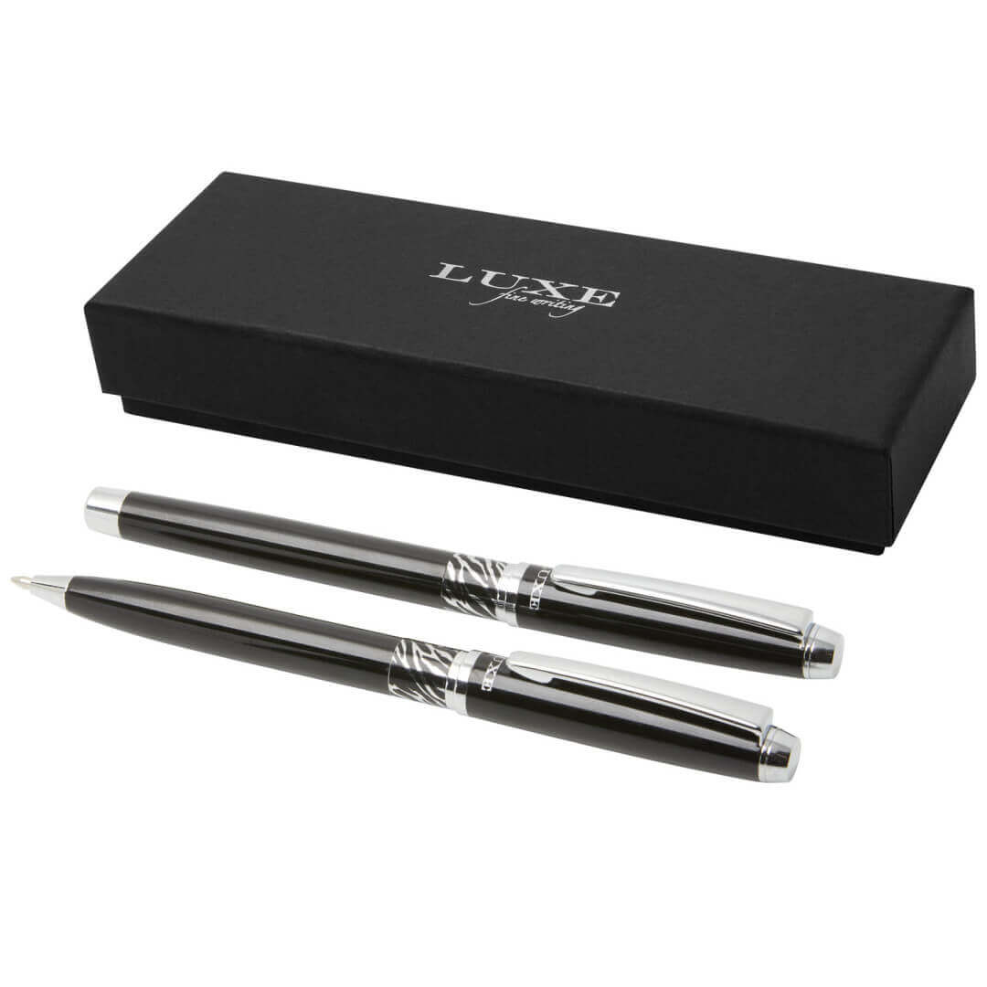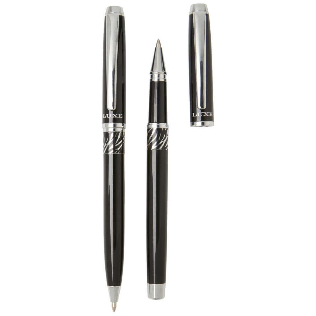 Sada kuličkových per a kuličkových roller per s dekorativním vzorem na těle. Kuličkové pero je předem naplněno modrým inkoustem, zatímco kuličkové roller pero je předem naplněno černým inkoustem. Zabaleno v dárkové krabičce "LUXE".