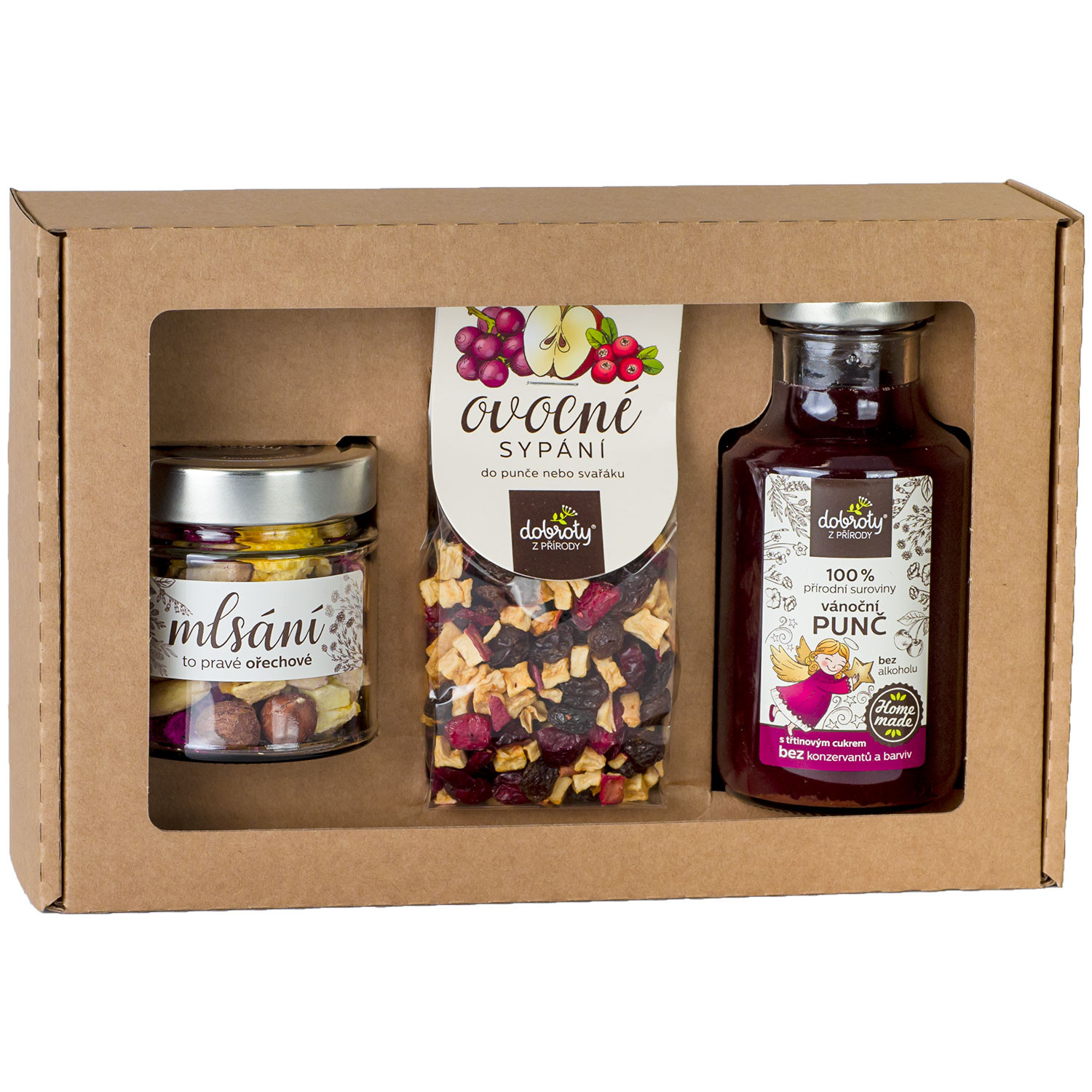 Vánoční punč bez alkoholu z kvalitních 100% přírodních surovin, s lahodnou chutí jablka, višní a koření jako badyán, hřebíček či muškátový oříšek. Ideální pro přípravu voňavých horkých nápojů během zimních večerů. Doplňuje ho ovocné sypání s nesířenými rozinkami, brusinkami a sušenými jablky a ořechové mlsání s exotickým lyofilizovaným ovocem.