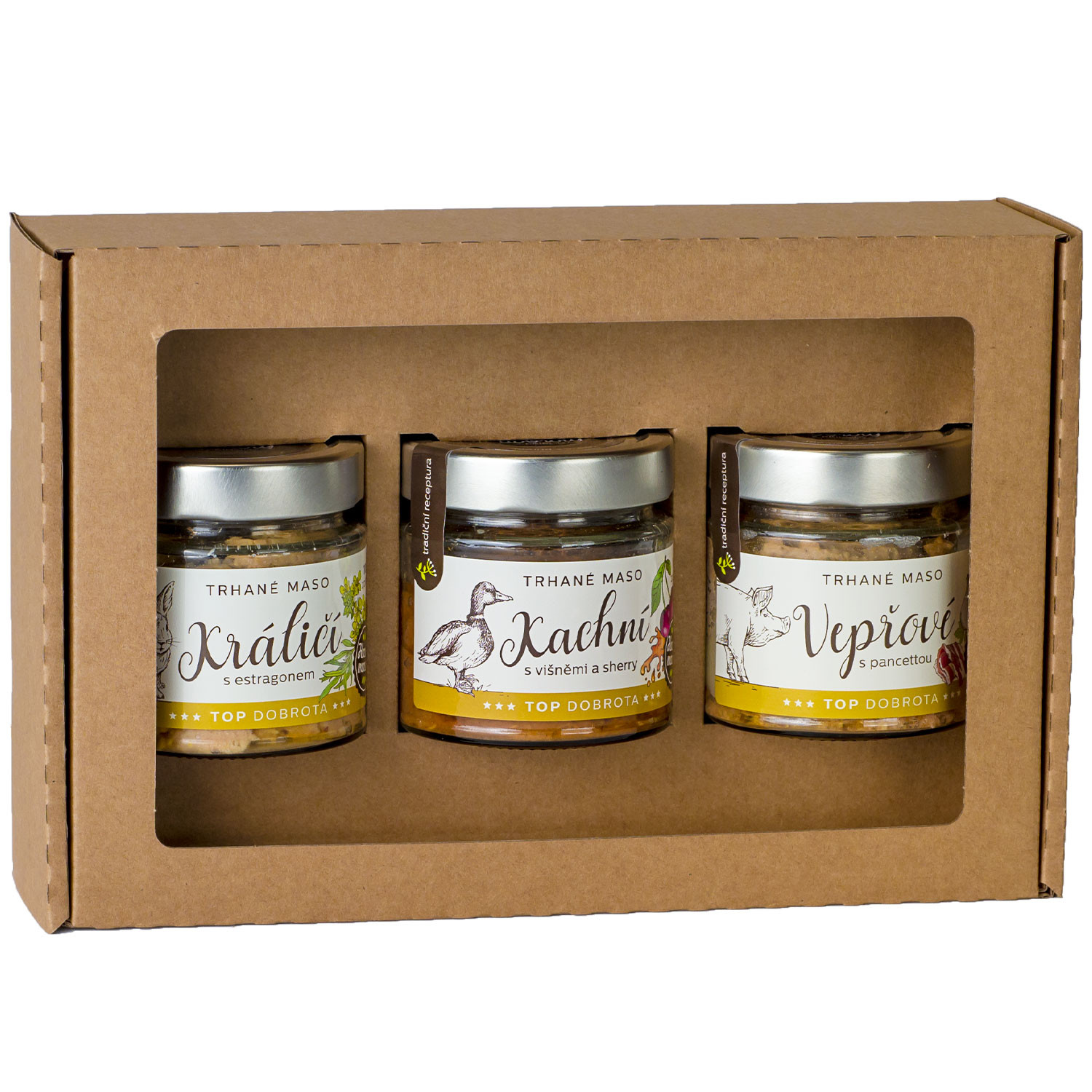 Dárkový balíček se třemi druhy trhaného masa – kachní s višněmi a sherry, králičí s estragonem a vepřové s pancettou. Každý druh je ručně připravená lahůdka, která potěší chuťové pohárky milovníky kvalitních masných výrobků.