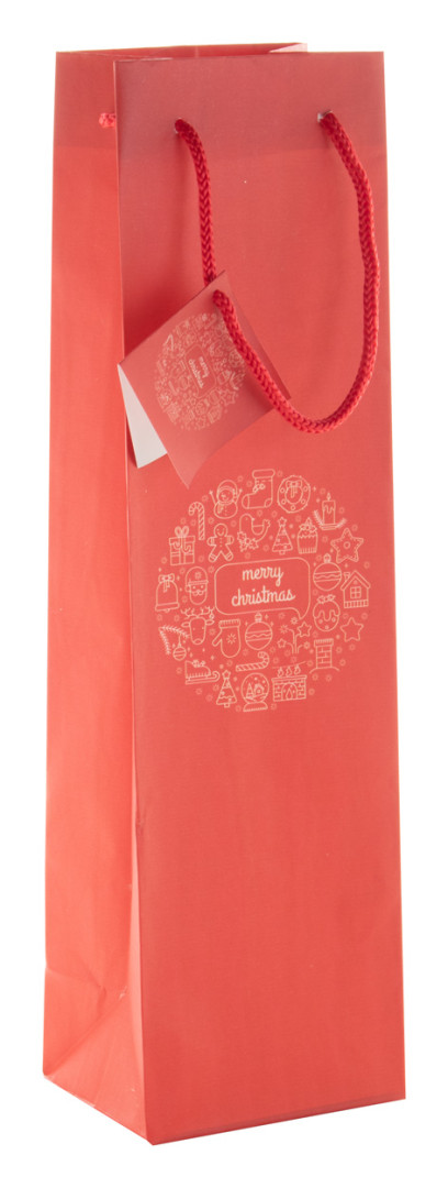 Papírová dárková taška na láhev vína s matným laminem ve vánočním designu a s dárkovou visačkou.
