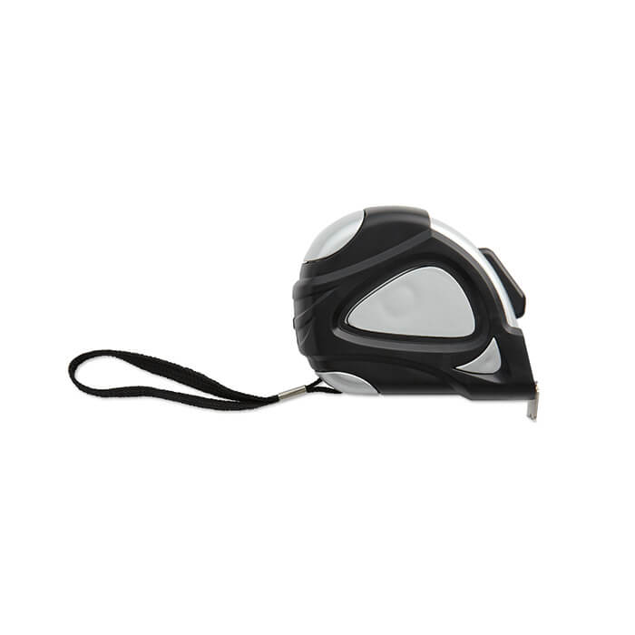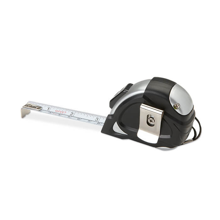 3m ABS profesionální měřicí pás ve stříbrném a černém balení. Obsahuje řemínek na ruku a lesklé stříbrné zapínání na kovovou sponu.
