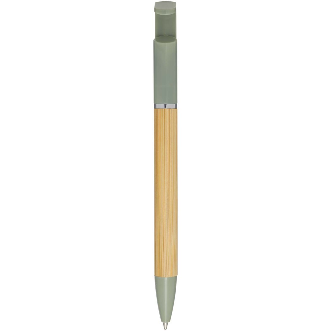 Bambusové kuličkové pero, které funguje také jako držák na telefon. Tlačítko a středový kroužek jsou vyrobeny z recyklovaného plastu, hrot z mosazi a tělo z bambusu z odpovědných zdrojů. Barva inkoustu: Černá. Délka psaní: 1000 metrů. Rozměr hrotu: 1,0 mm.