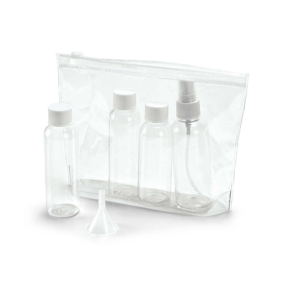 Vzduchotěsná kosmetická taška z PVC, jejíž součástí jsou 3 lahvičky (2 x 65 ml a 1 x 60 ml), 1 rozprašovač (80 ml) a 1 nálevka. Ideální pro cestování letadlem.