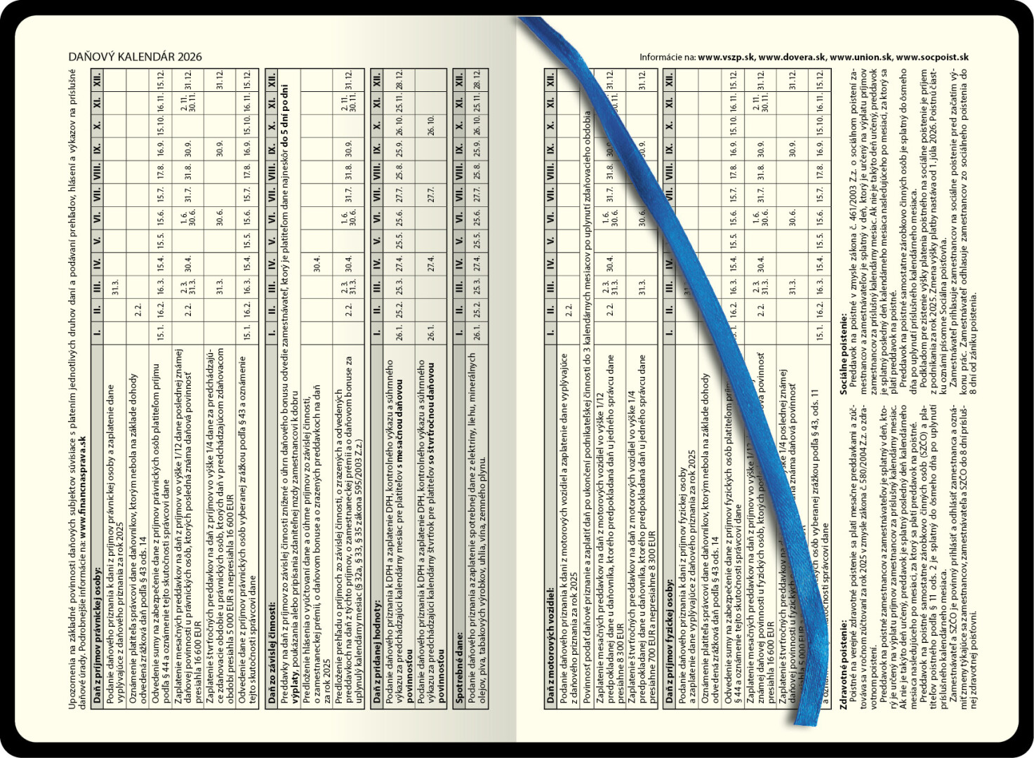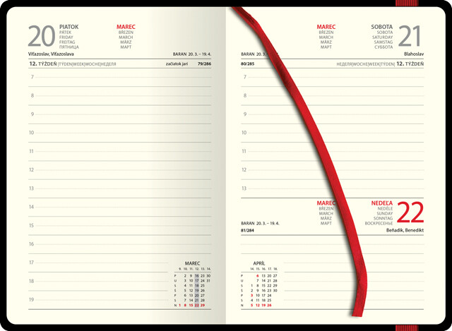 Denní diář s přehledným kalendáriem na každý den, poutkem a vložkou na pero, pružným uzávěrem a praktickou kapsou. Diář je v pevné vazbě z ekokůže a s vyraženým letopočtem. Součástí je slovenský kalendář.