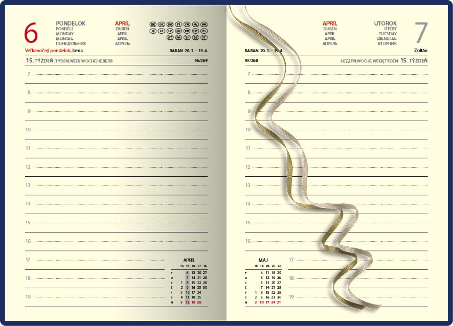 Oblíbený diář má odolný povrch s motivem folklorní stuhy. Efektní ražba fólií a 3D lak vytvářejí dokonalý design. Jediný svého druhu na trhu. Součástí je slovenský kalendář. Strany diáře jsou potištěny barevným motivem.