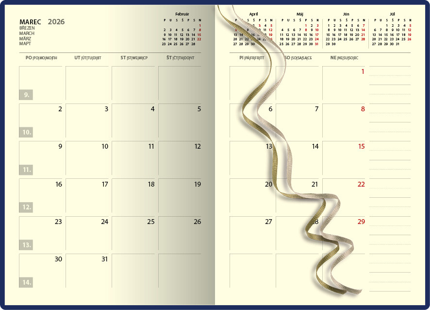 Luxusní diář z ekologické kůže s přehledným kalendáriem na každý den. Diář má pevnou vazbu s přední a zadní stranou z pěnového kartonu, je doplněn ozdobným prošíváním po obvodu diáře, stříbrnou plaketou s letopočtem a dvěma lacetkami. Součástí je slovenský kalendář.