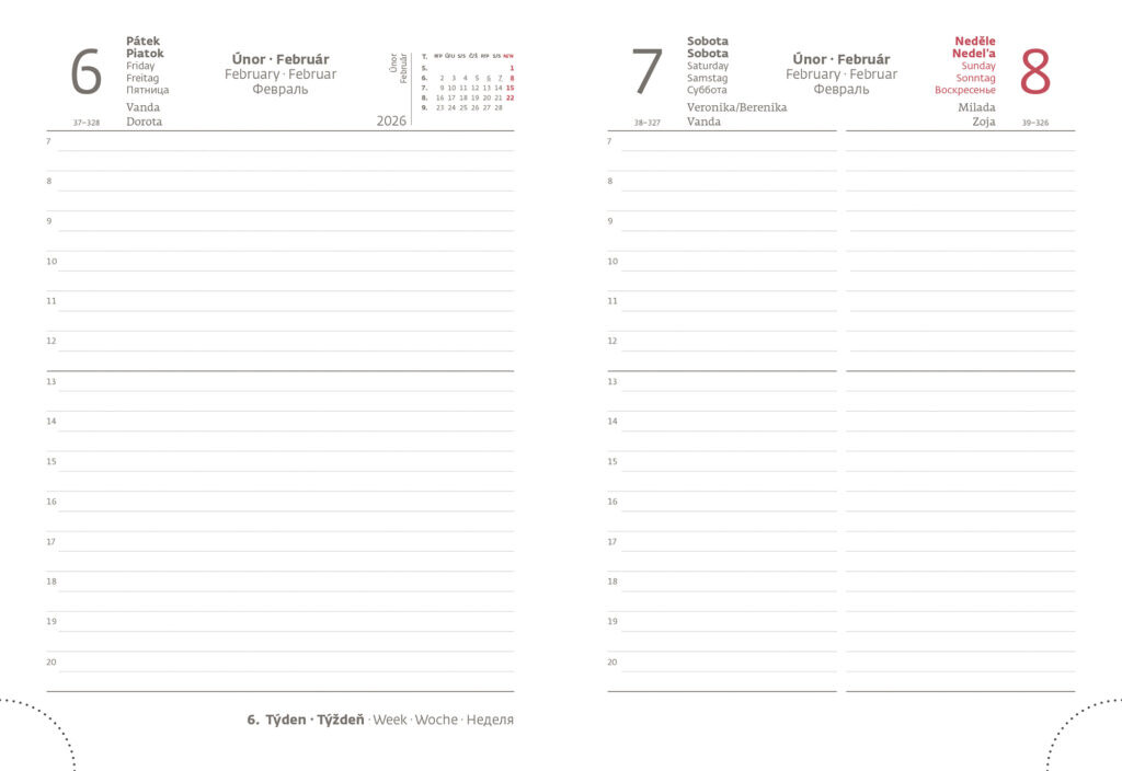 Diář obsahuje: osobní údaje, plánovač dovolené (měsíční přehled), plánovací kalendář, telefonní předvolby, státní svátky České a Slovenské republiky, mezinárodní svátky, roční výhled, denní layout, adresář, mapa Evropy a České a Slovenské republiky