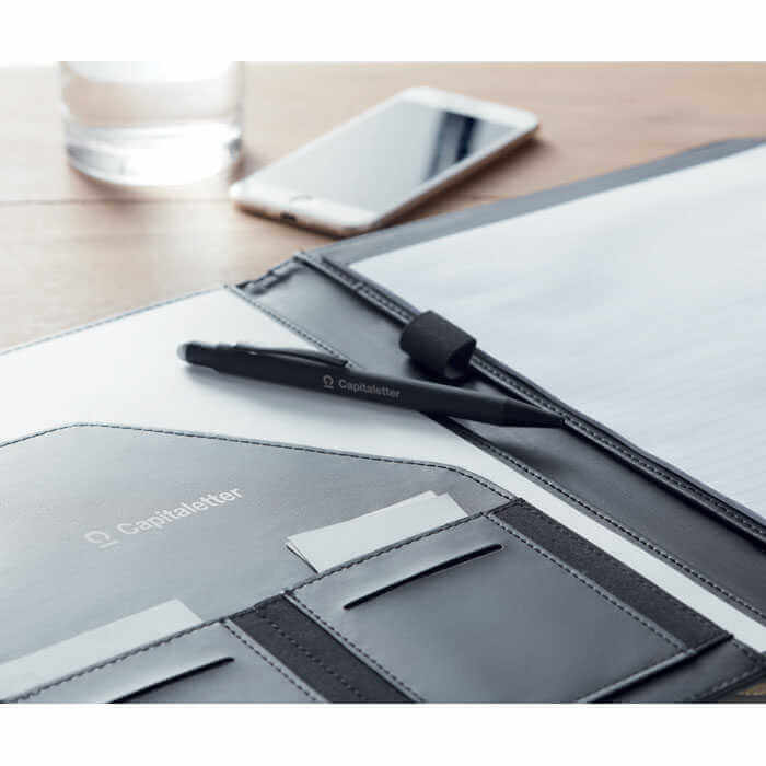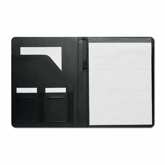 Elegantní portfolio o velikosti A4 z dvoubarevného materiálu 300D RPET. Mějte v těchto užitečných kancelářských deskách uspořádanou veškerou práci. Má vnitřní přihrádky a poutko pro uložení pera nebo tužky. Součástí je linkovaný poznámkový blok na 20 listů. Obal je vyroben z recyklovaného materiálu PET.