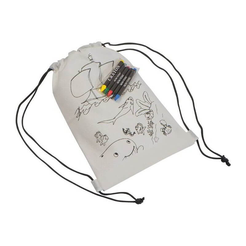 Dětská sada sestává z voskovek (5 různých barev) a z non-woven sáčky s povrchovými motivy, které jsou vhodné také na vybarvení voskovkami. Jako potisk doporučujeme sítotisk
