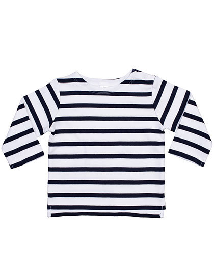 Organická bavlna nebo přechod na organickou bavlnu | Proužky barvené příze 16 mm x 8 mm | Námořnicky modré patentky bez niklu na rameni pro snadné oblékání | Nakládaná vsadka | Boční průduchy | Prodloužený zadní díl | Měkká a pružná tkanina | Postranní švy. 200 g/m².
